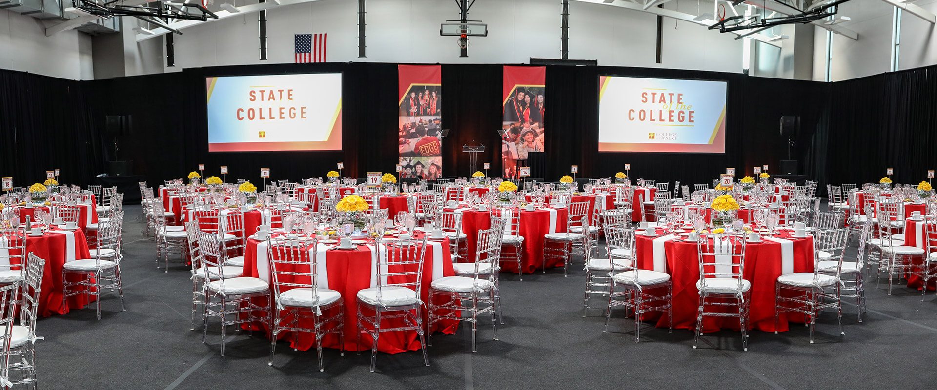 MOMENTOUS worked with College of the Desert to produce their esteemed “State of the College” program. This event required the full transformation of their gymnasium building to become a business theater environment paired with a gracious luncheon for their VIP audience. Strategic event services provided included strategy, creative, management, design and décor, off premise catering, and advanced technical production.